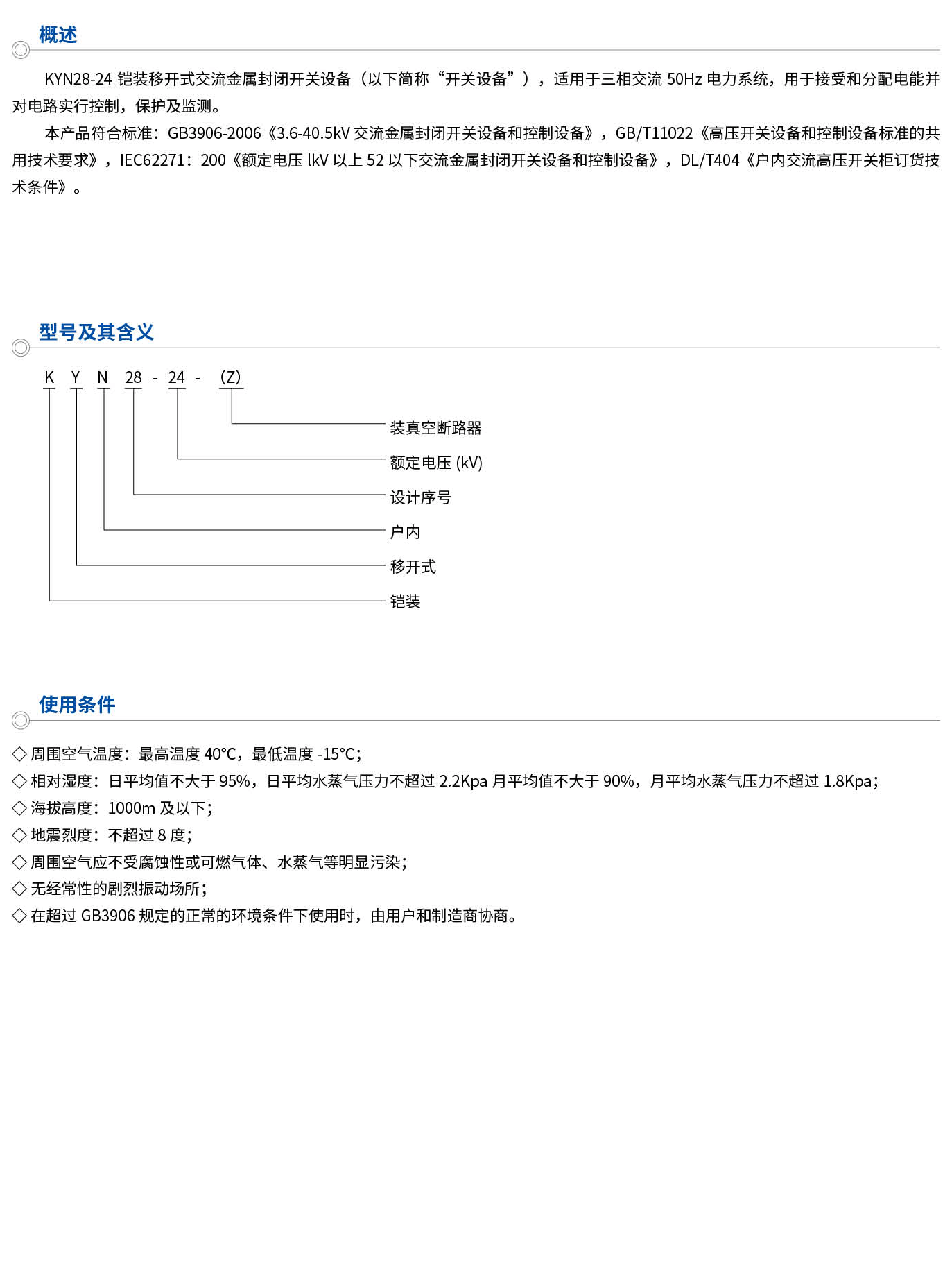 KYN28-24 armored removable AC metal-enclosed switchgear (hereinafter referred to as "switchgear"), suitable for three-phase AC 50Hz power system, used to receive and distribute electric energy and control, protect and monitor circuits. This product complies with the standards: GB3906-2006 "3.6-40.5kW AC metal-enclosed switchgear and control equi···
