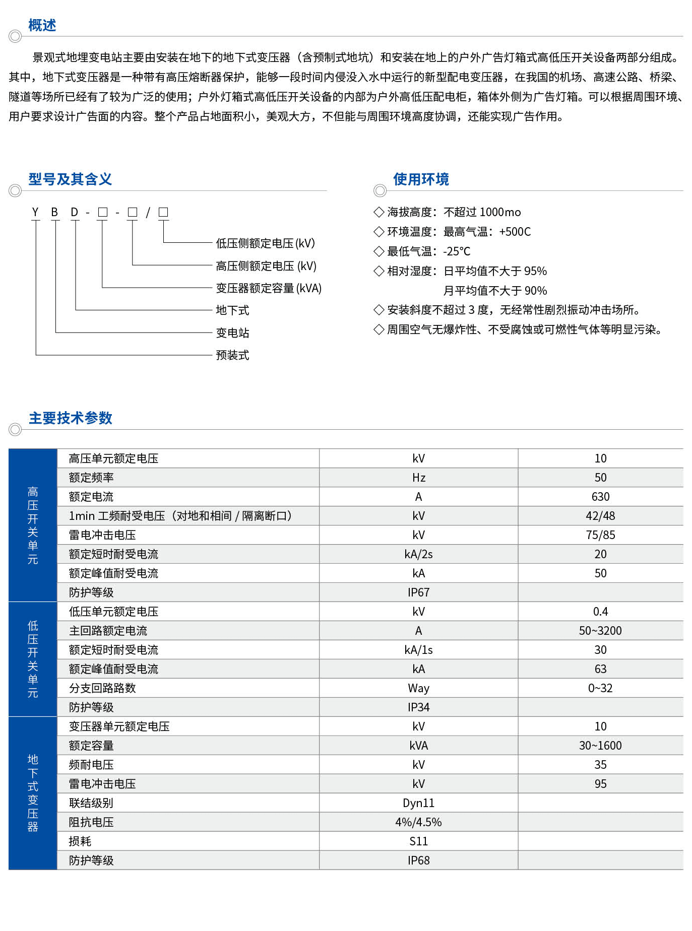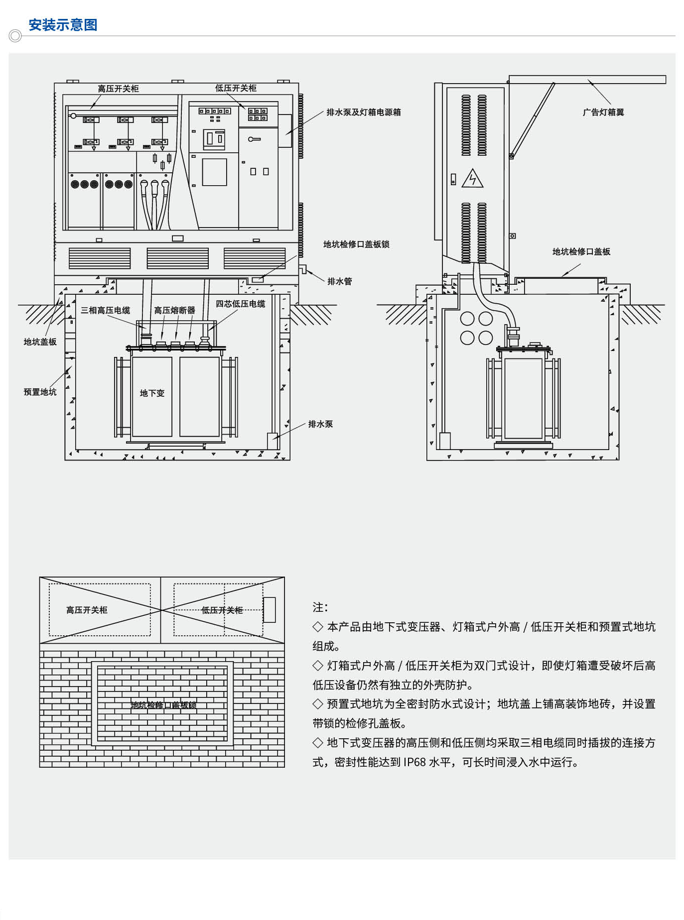 景觀式地埋變電站主要由安裝在地下的地下式變壓器(含預(yù)制式地坑)和安裝在地上的戶外廣告燈箱式高低壓開關(guān)設(shè)備兩部分組成。其中,地下式變壓器是一種帶有高壓熔斷器保護(hù),能夠一段時(shí)間內(nèi)侵沒入水中運(yùn)行的新型配電變壓器,在我國(guó)的機(jī)場(chǎng)、高速公路、橋梁、隧道等場(chǎng)所已經(jīng)有了較為廣泛的使用;戶外燈箱式高低壓開關(guān)設(shè)備的內(nèi)部為戶外高低壓配電柜,箱體外側(cè)為廣告燈箱??梢愿鶕?jù)周圍環(huán)境、用戶要求設(shè)計(jì)廣告面的內(nèi)容。整個(gè)產(chǎn)品占地面積小,美觀大方,不但能與周圍環(huán)境高度協(xié)調(diào),還能實(shí)現(xiàn)廣告作用。